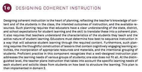 All about danielson's framework component 1e the what coherent instruction, component 1 e, signifies that that the outcomes, assessments, materials, activities, teaching methods, and standards match up and flow in a logical way. In order to do this, we must be knowledgeable of the state standards, curricular standards, and how they progress and build. We need to make sure that.
